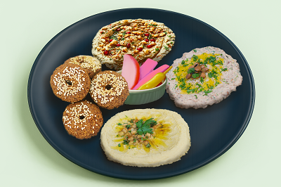 Der Alleskönner! Vier Falafel, Hummus, Baba Ghannoush, Foul Medames und eingelegtes Gemüse.