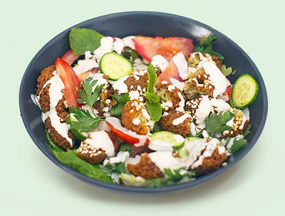 Die Innovation! Frischer, gemischter Salat mit Falafel-Popcorn und Tahini-Sauce.