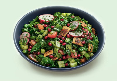 Der Frischekick! Knackiger, gemischter Salat mit Fladenbrot-Croutons und Granatapfel-Vinaigrette.