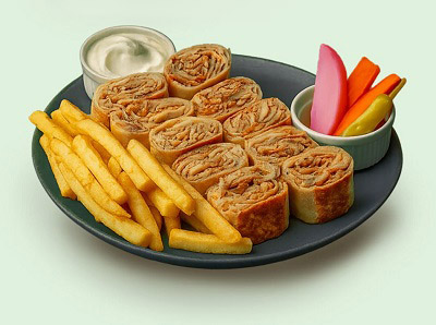 Die B0mbe! In Häppchen servierter Shawarma-Wrap mit Pommes, eingelegtem Gemüse und hausgemachter Knoblauchsauce.